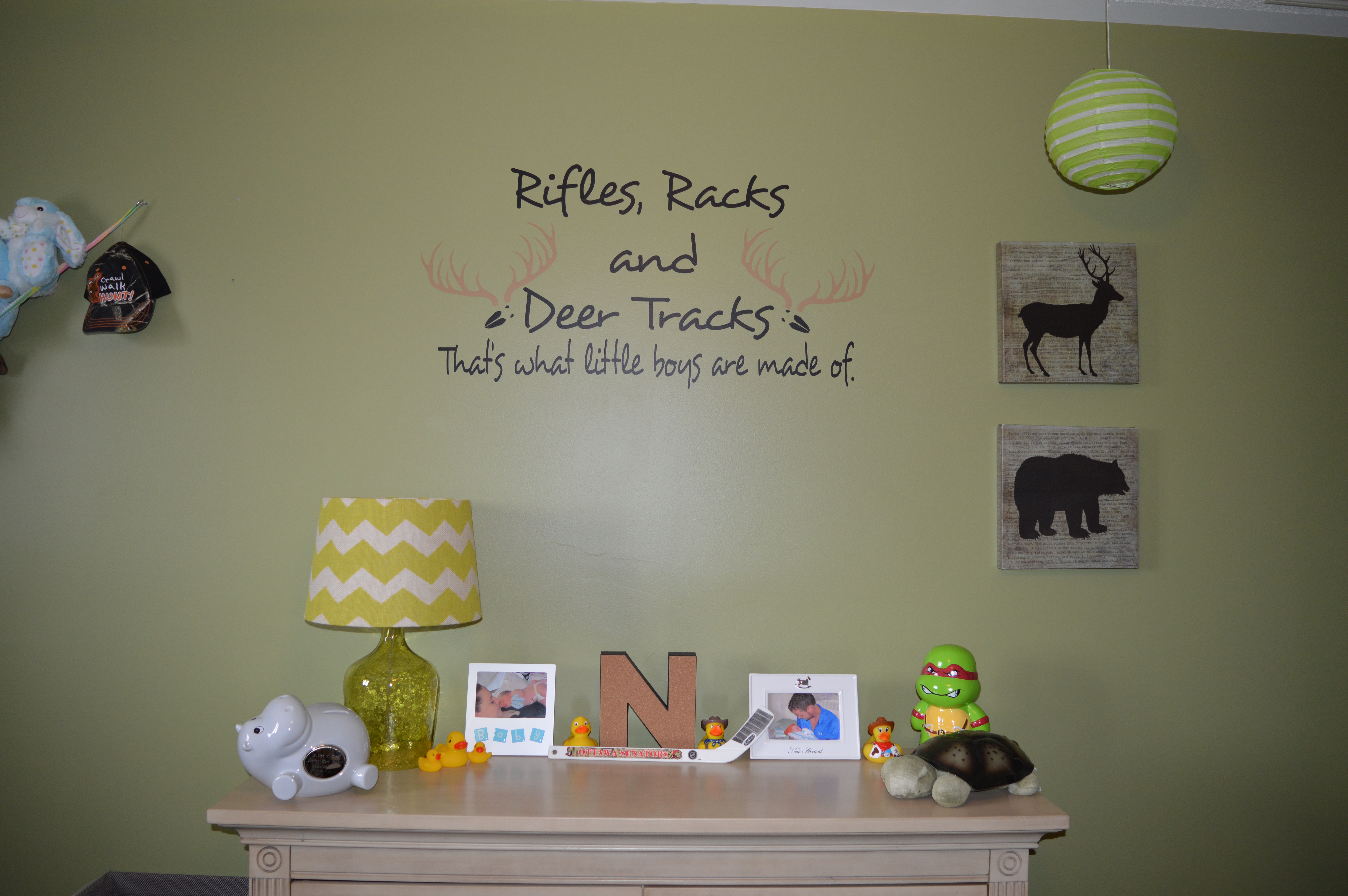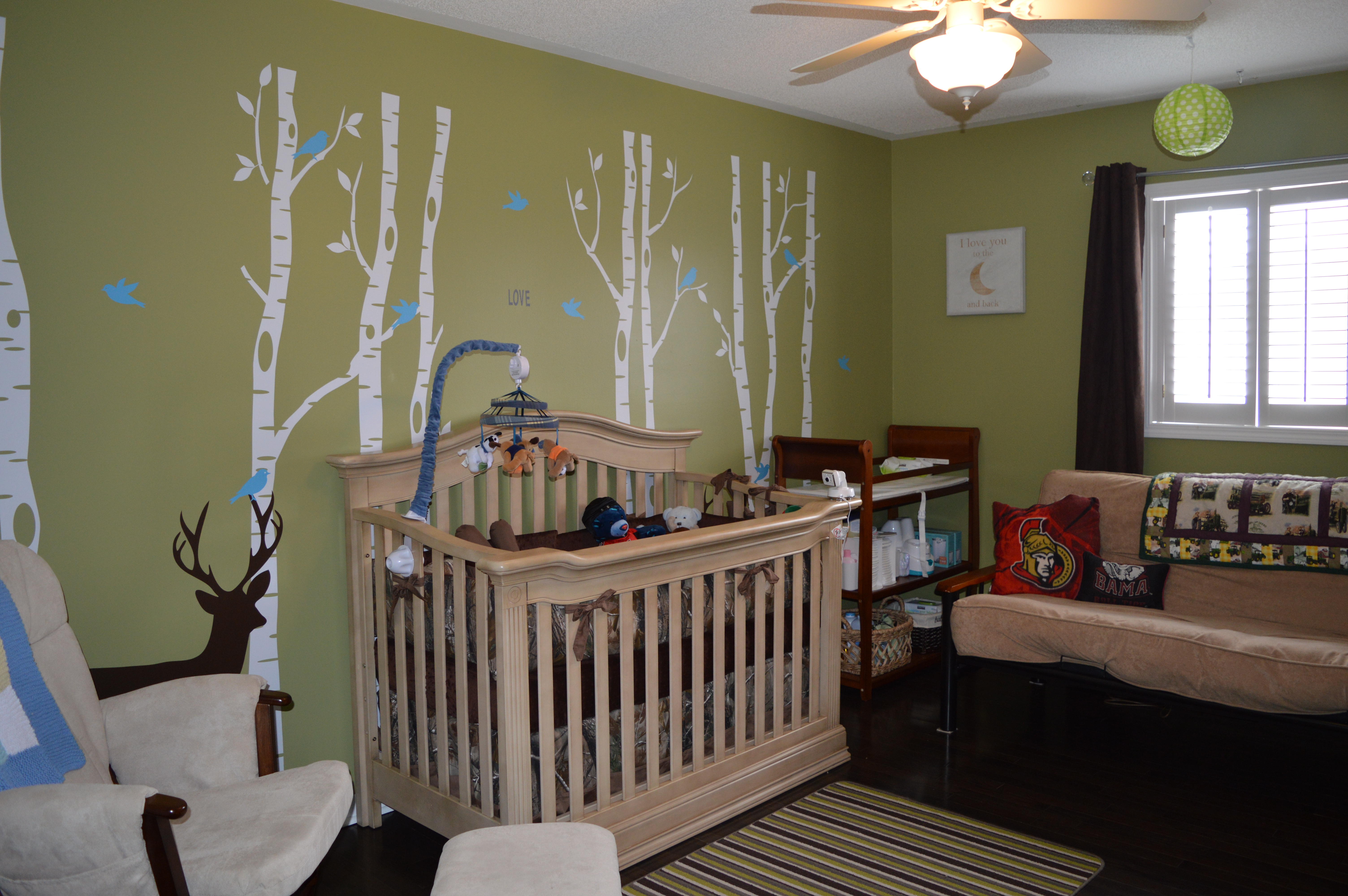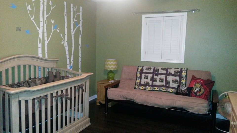 When we moved into our home, we had two spare rooms. One was bubble gum pink and the other army green. Kurt and I decided when we had kids it would make sense to use the biggest room as the nursery and the smaller of the two as just a guest room. Well the second bedroom sat basically empty except for a futon and side table and the third room was completely empty for almost two and a half years. The moment we found out we were expecting, we decided to get the spare bedroom ready. I knew if we were having a boy I wanted to do a forest theme nursery, meaning we’d have two green bedrooms. This didn’t sit well with me and my colour ocd so we decided to paint the third bedroom a nice saltwater blue. Once we got that room set up, we just had to wait and see what we were having. As soon as we discovered it was a boy I started planning the nursery.