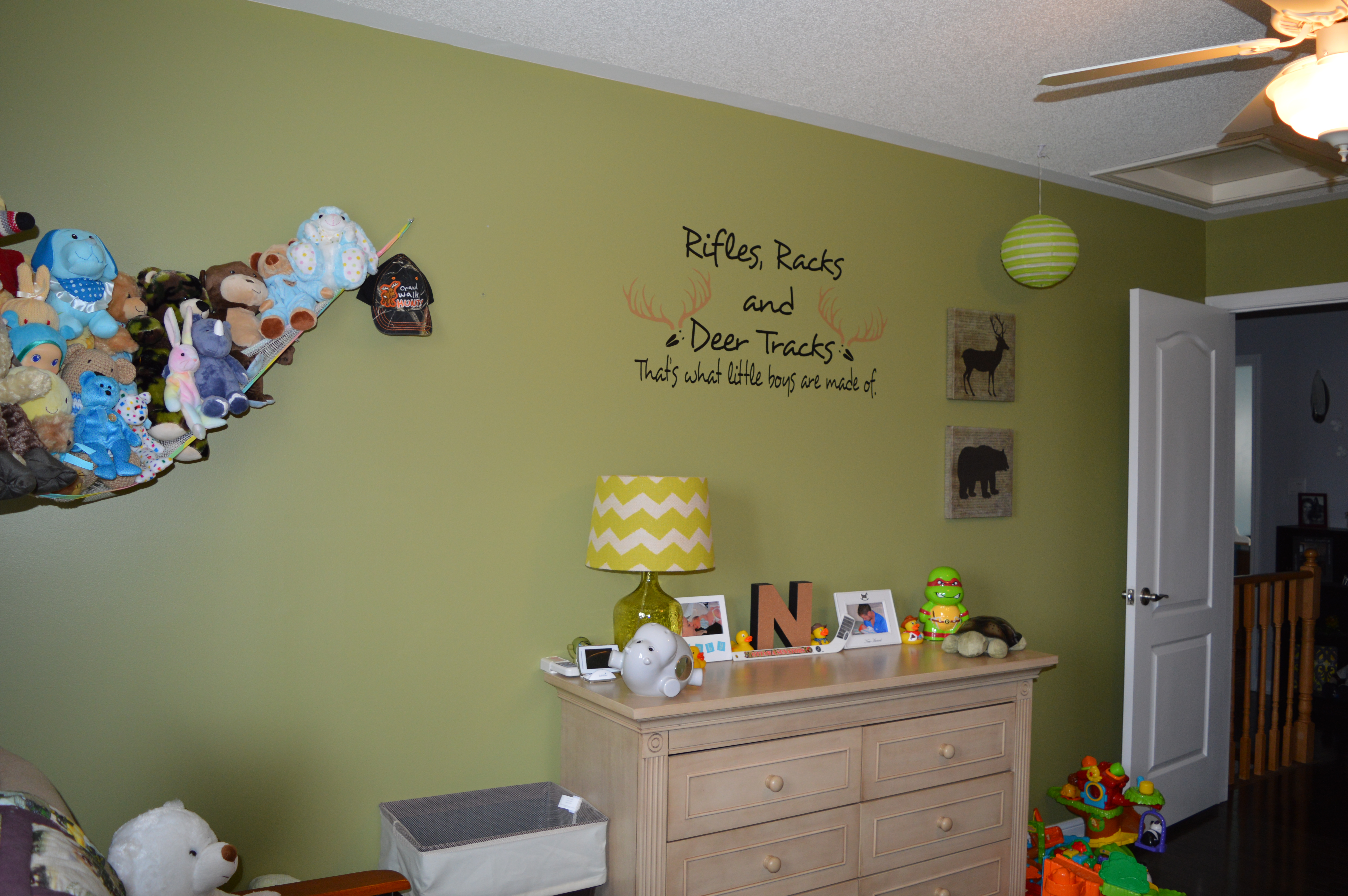 So after a few more weeks the room really started coming together, however; I still cannot help myself. Every time I see something that I think match his room, I just have to get it. I think most recently I’ve added a small rug in front of the crib, put up some picture frames, got some more wall art, and put up the countless stuffed animals he has. I think I now know why my parents never wanted me to get any more stuffed animals. They take up so much room! Haha