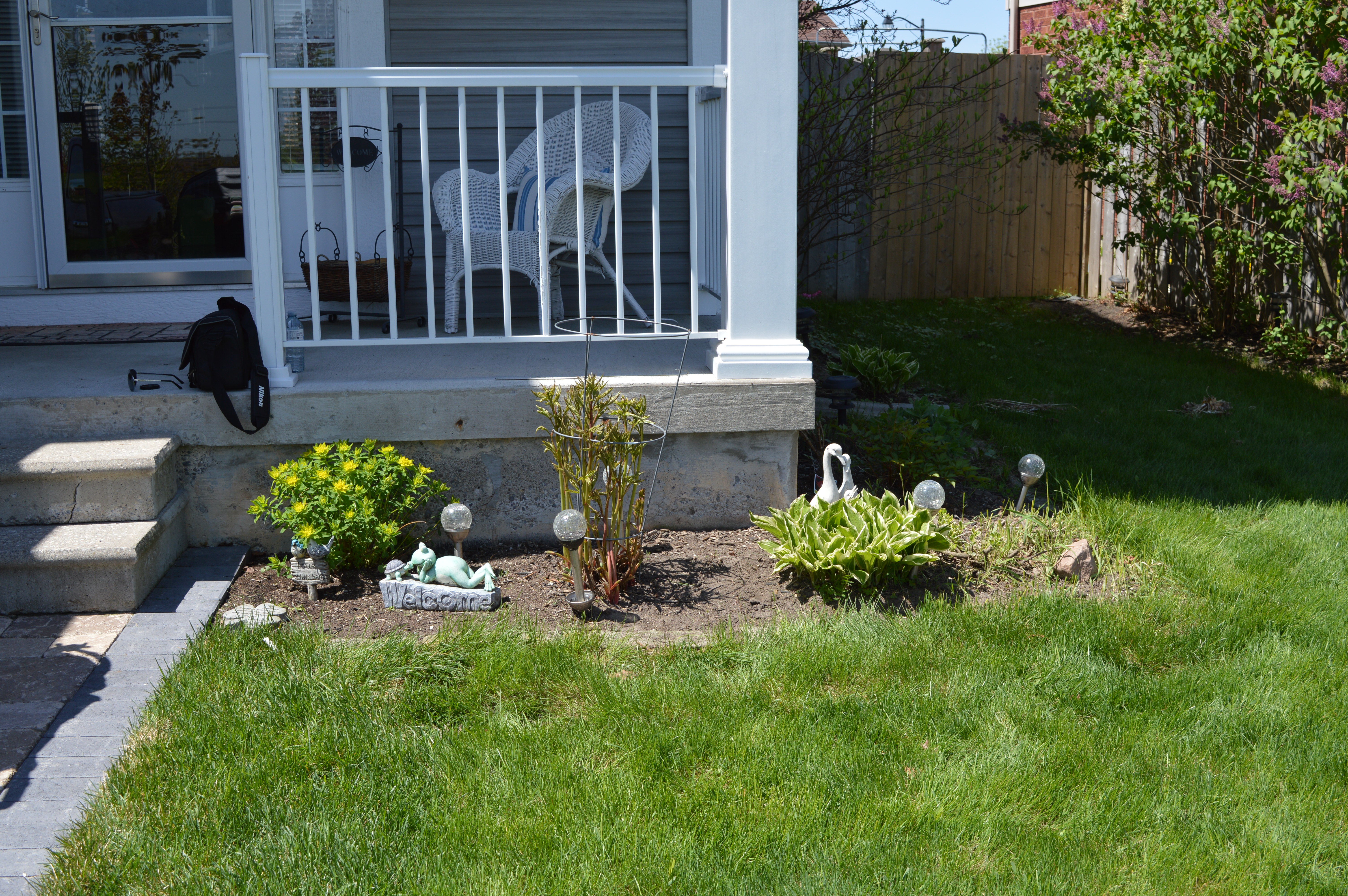 This is what the garden started out looking like. Last year Kurt put in the walk way and dug out two huge bushes at the side of the house and made a little garden for me.