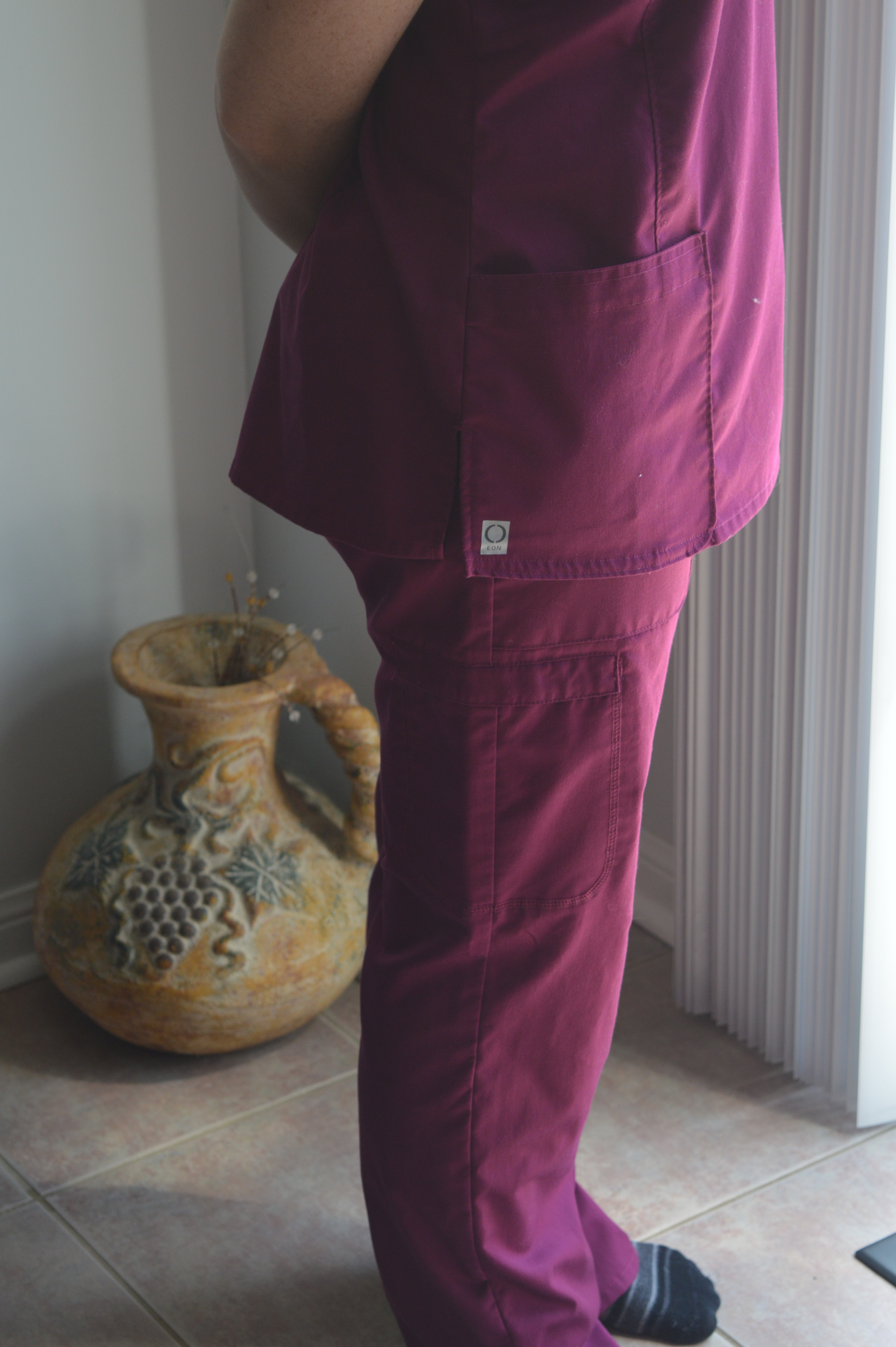 There’s loads of great colours to choose from as well. The ones I received were in the wine colour which is almost like a magenta/purple colour. I received several complements on not only the style but the colour as well while I was wearing them at both workplaces. And on Maevn’s website there’s actually a chart geared towards helping you determine what size will fit you best. It’s goes as in depth as telling you the bust, waist, hip, and inseam measurements. That way no matter if you’re 5’3 and a size 6 like me or 5’10 and a size 3, you can always find what will fit you best. I haven’t come across this before when buying scrubs and now when I’m not wearing my Maevn EON/EON Active scrubs, I find myself wishing I was, not only for the looks but also for the fact that I don’t need to roll my pants cuffs at least two times so they’re not dragging on the floor!