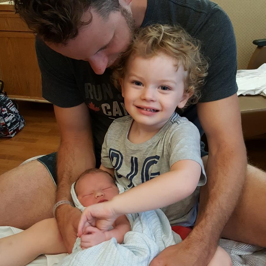 It’s hard to believe that Eli has been in our arms for one full week now! He’s already starting to show his personality and from what we’ve already experienced, he’s definitely going to have us wrapped around his teeny, tiny fingers just like his older brother. He loves to snuggle and unless you’ve cuddled him to 100% completely asleep, he will definitely wake up if he’s put down in the bassinet or swing. His favourite spot to snuggle into is the crook of your neck. He will literally push himself with his little chicken legs up your torso until he’s smushed his face into your neck and his head is safely tucked under your chin. While it’s super adorable and I love every minute of it, I do get a little paranoid when he demands his entire face be covered up. Silly boy!