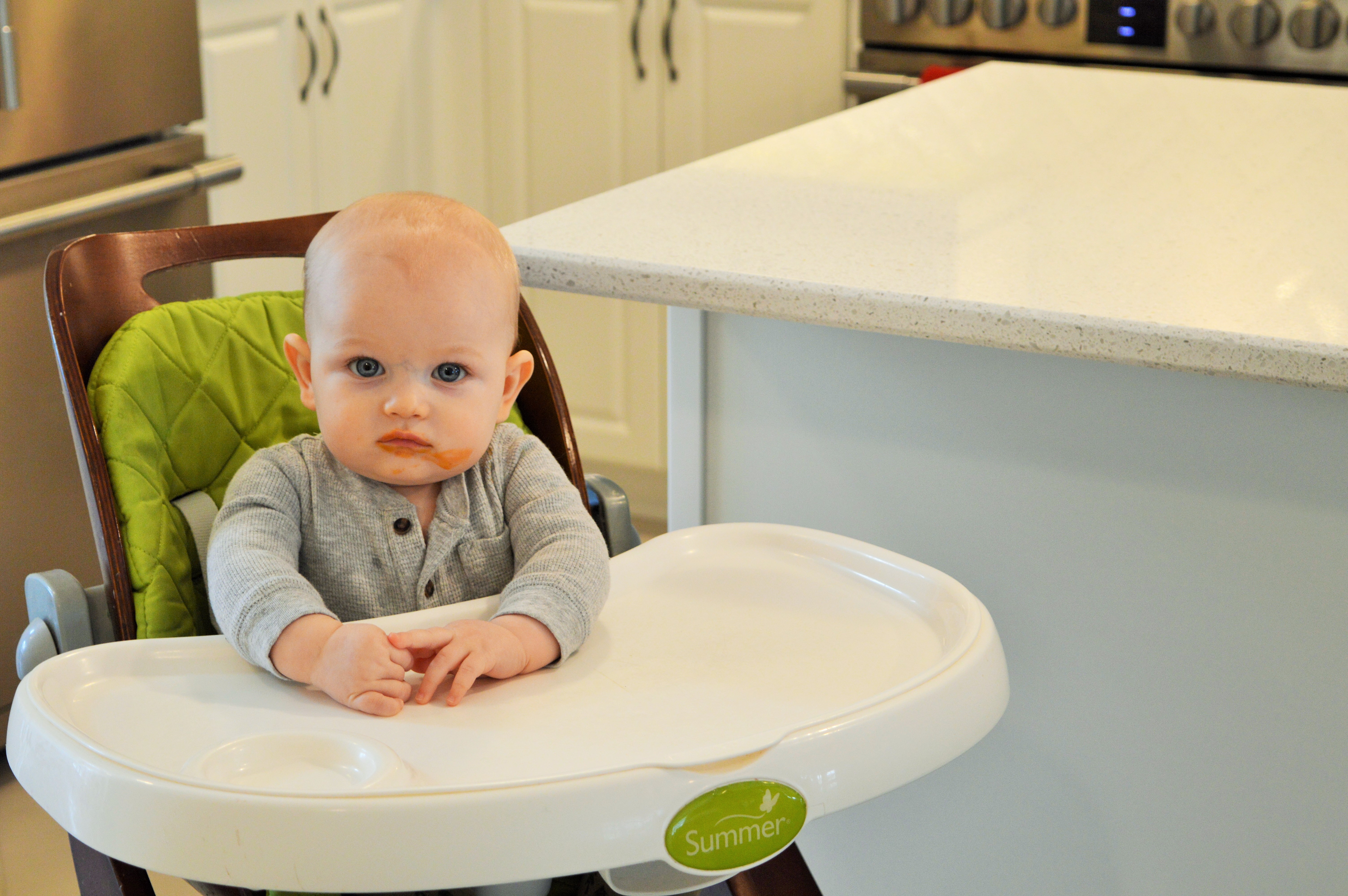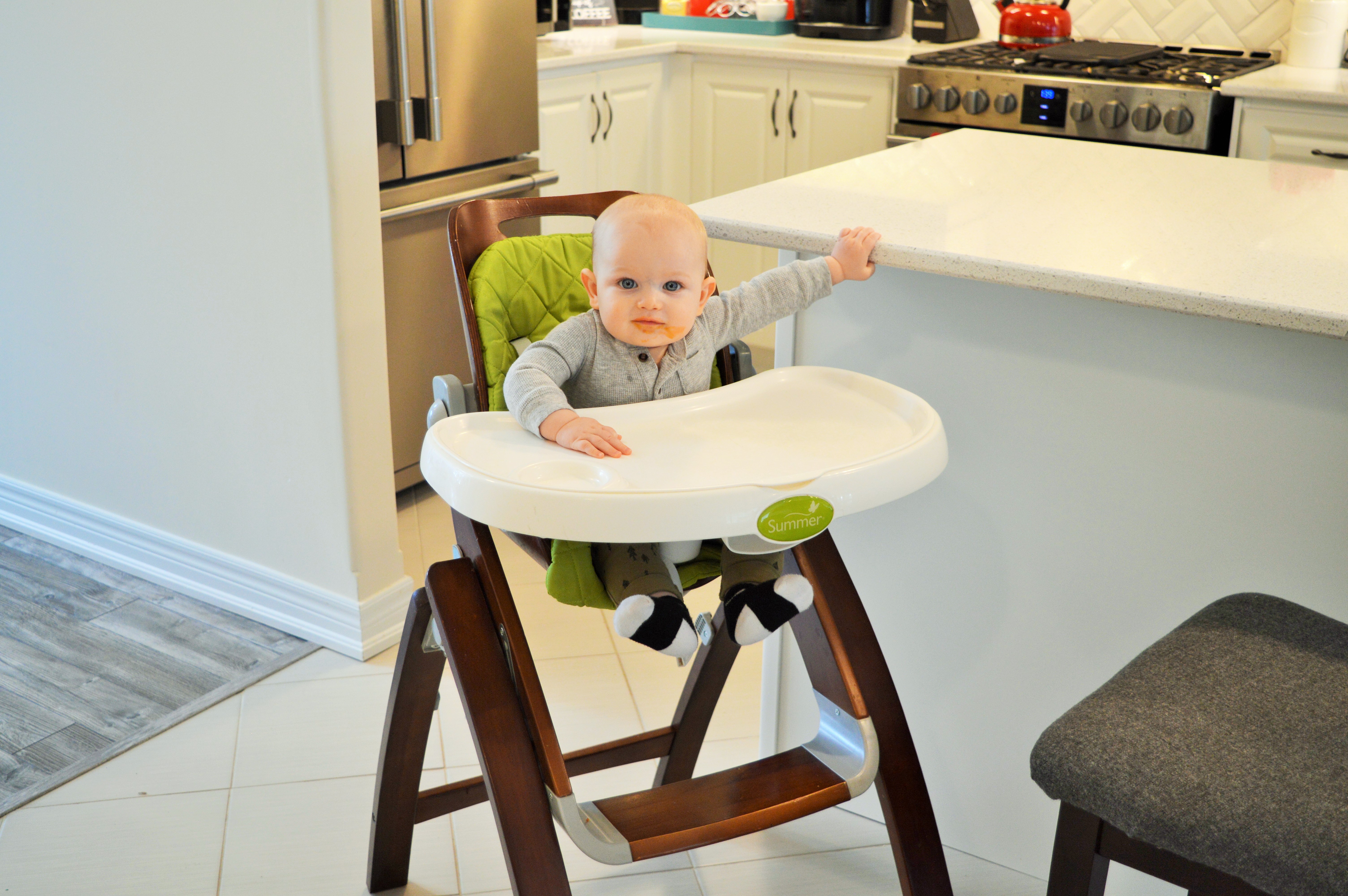 We finally settled on the Bentwood High Chair by Summer. We liked the modern look of the wooden frame and it was stained in a similar colour to the dining table and chairs set we had in our kitchen at the time. The seat padding was even a nice shade of green that would compliment some of the bright artwork and frames we had on our kitchen walls. It seemed like the perfect match for us and the best part was the price which was well within our budget. For three years this high chair has served us well. Heck, up until a few weeks ago, Nate still would eat his meals in it but since we’ve started introducing solids to Eli, I have found myself thinking it might be time for a change. For one, the chair itself is seeming a little unsteady lately. Even with the screws and bolts tightened as much as they can be, it still seems to wobble a bit and that is definitely concerning to me. Another issue I’ve been having is that the removable table top no longer glides in as smoothly as it once did. Obviously, this is just due to prolonged use but it does still bother me from time to time and I worry about Eli’s fingers accidentally getting caught when I have to occasionally force the table on. And lastly, the style of chair doesn’t fold up for easy storage meaning it’s always out in the open, and now the green seat padding stands out like a sore thumb in our new house which has red kitchen accents and teal blue living room colours.