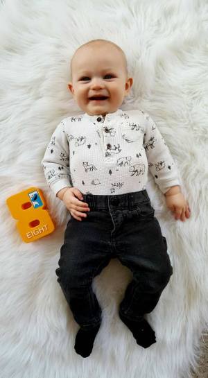 Wearing clothes that range in size from 6 months to 12 months (just depending on the make)
