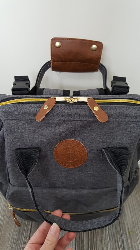 The details in the bag are stunning as well. From the faux leather accents to the metal zippers, this bag is not only functional but stylish as well. The straps are nicely padded to help prevent any discomfort when wearing the backpack and they adjust incredibly easy. Even with the diaper bag filled, I was able to adjust the straps tighter or looser while actually wearing the backpack and it didn’t take longer than a few seconds before they felt right for me. Another feature I love about this backpack are the four luggage feet that are on the bottom on the bag. These allow the backpack to stand on it’s own and help to prevent any wear and tear to the bottom of the bag. Anchored East Co also has provided their backpacks with not one but two ways to attach it to things like strollers or shopping carts. You can either use the leather strap at the top or the two large buckle clasps on the sides. Both are easy to use and provide a safe way to attach your backpack while you’re out for a walk or shopping.