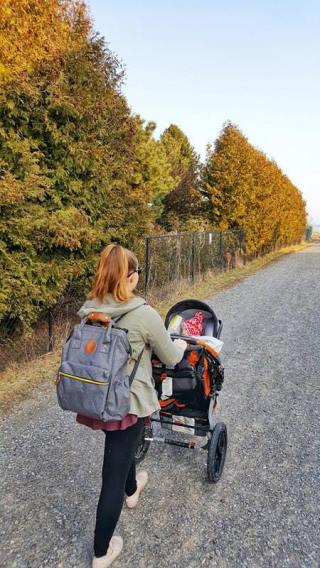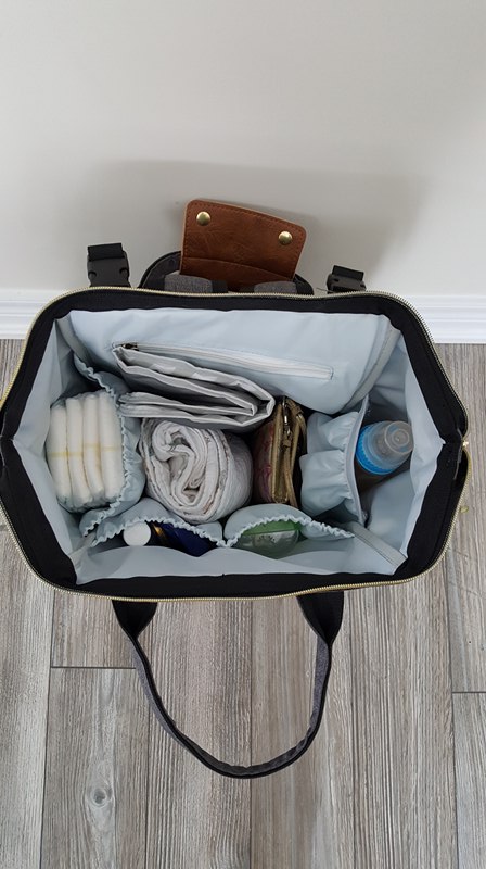 But my most favourite thing about this bag has to be the amount of pockets it has! Not only are there four massive outside pocket, there are also four large inside pockets including one zippered one to store items you want to keep extra safe. The front zippered pocket is awesome for items you need to grab quickly (snacks, toys, books) while the one side pocket is perfect for water bottles or sippy cups. Wet wipes are perfect to store in the side pocket with the zipper and the breathable mesh fabric on the back pocket, means you don’t have to worry about possibly ruining whatever you’re storing in their with back sweat (hahaha!!). The pockets inside the bag can house whatever items you need on your day to day outings. Currently mine is full with diapers, hand sanitizer, diaper baggies, a few of Nate’s toy cars, chapstick, a small container for Eli’s spare soother, changing pad (comes with the diaper bag!) as well as a swaddle blanket for breastfeeding in public as well as my wallet. One feature that I absolutely love about this bag in that one of the inside pockets in thermal insulated meaning you can store a bottle of milk or formula in it for a short period of time without worrying that it will spoil. Eli is almost strictly breastfed but it will definitely come in handy in the future as I start weaning him off or transitioning him to cow’s milk.